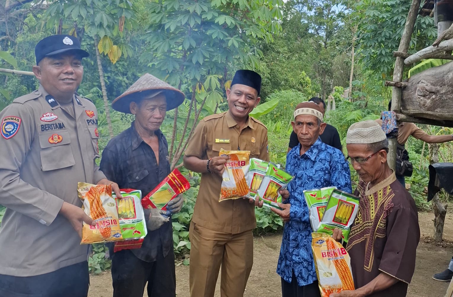 Tidak hanya itu, pemerintah desa juga menyerahkan bantuan bibit jagung kepada masyarakat sebagai bagian dari program ketahanan pangan desa. Bantuan bibit tersebut berjumlah 30 kg yang dibagikan di 4 titik diperuntukkan untuk lahan seluas kurang lebih 2 hektare dan bersumber dari Dana Desa tahun anggaran 2026.