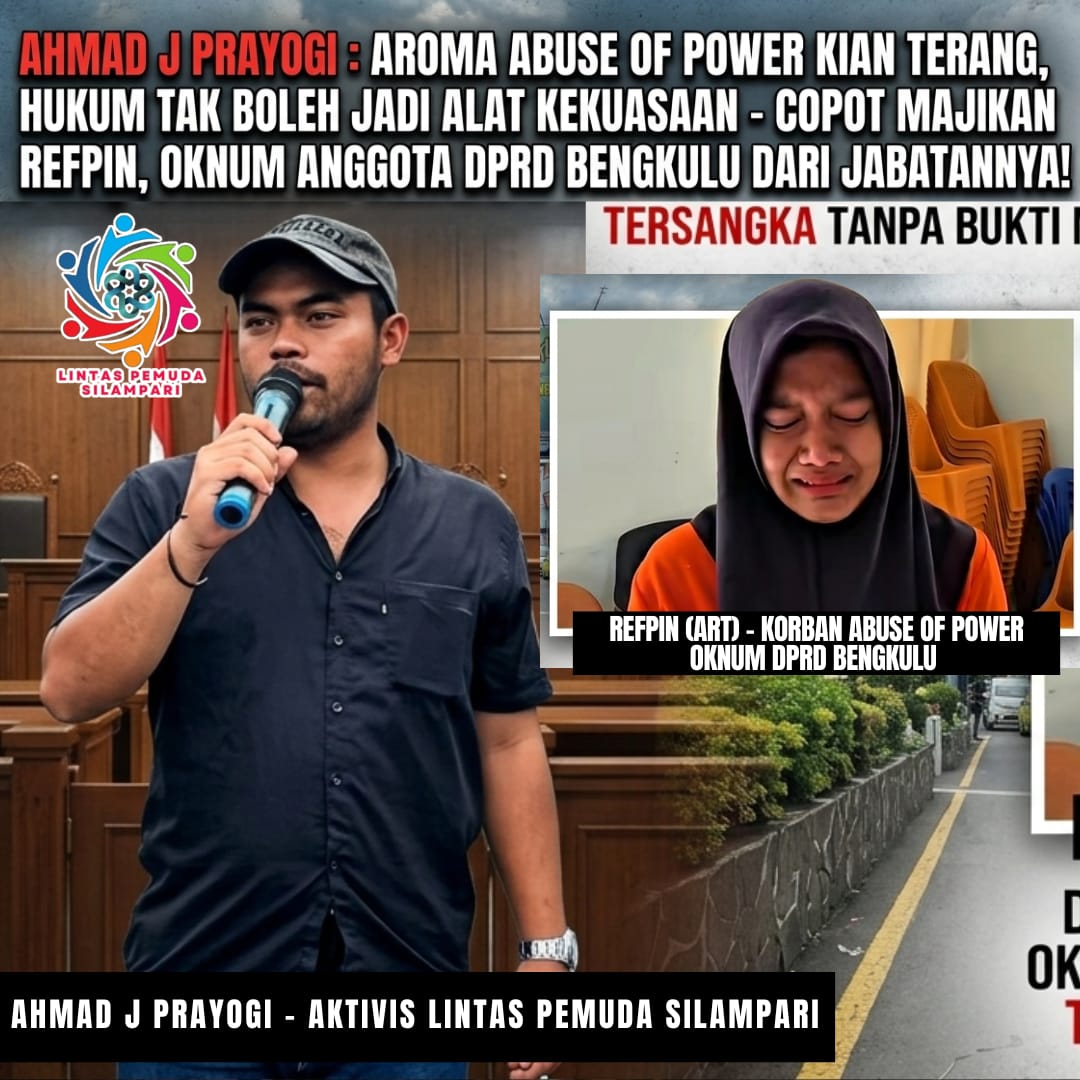 Elpublika.com-Koordinator Forum Lintas Pemuda Silampari, Ahmad J Prayogi, menyatakan sikap perlawanan tegas terhadap dugaan ketidakadilan dalam penanganan kasus asisten rumah tangga (ART) di Bengkulu yang menjerat Refpin Akhjana Juliyanti. Ia menilai, semakin banyak fakta yang terungkap justru semakin memperjelas adanya indikasi kuat penyalahgunaan kekuasaan (abuse of power).