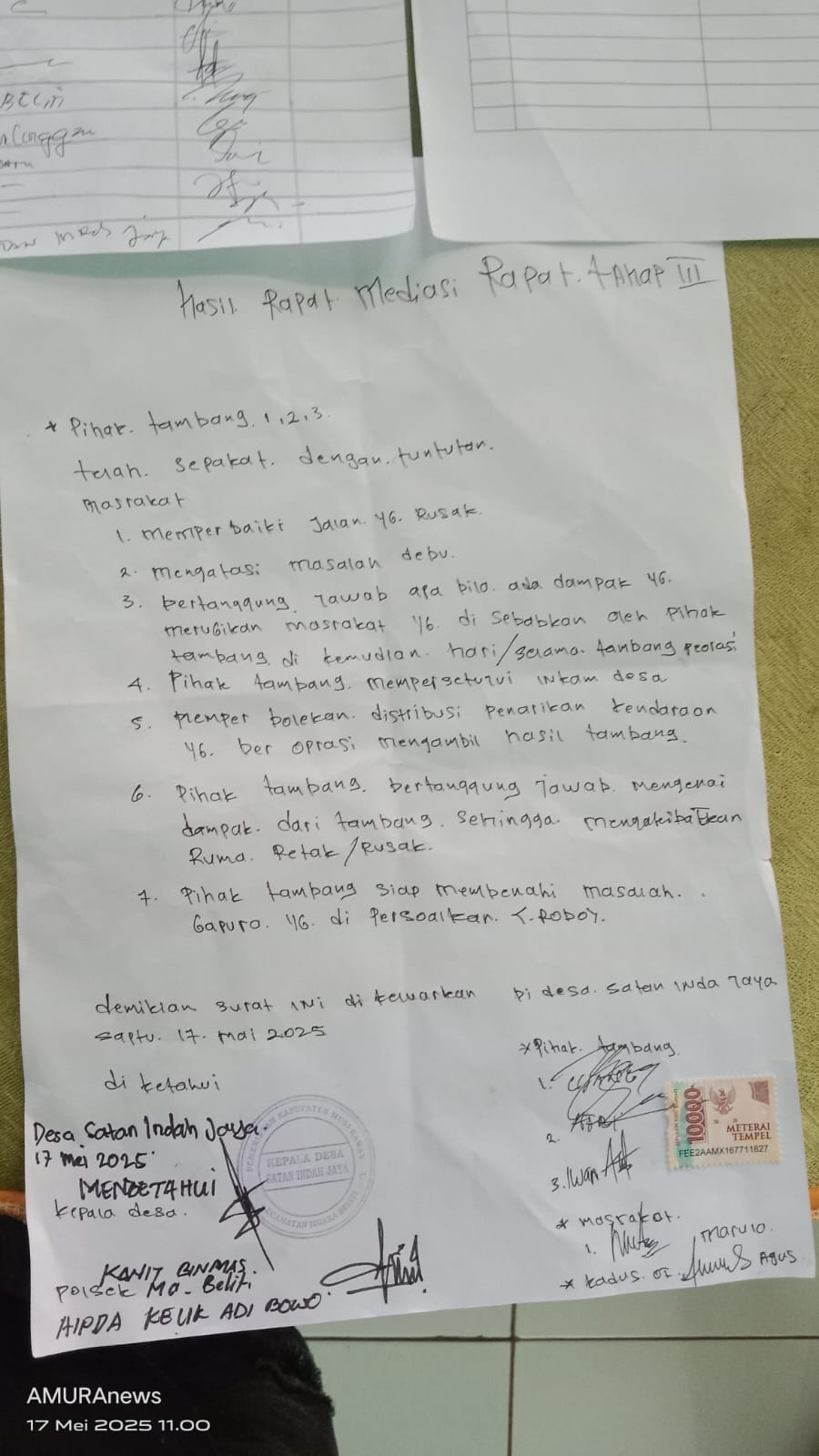 Kesepakatan ini disambut baik oleh masyarakat desa yang. merasa aspirasinya didengar dan ditindaklanjuti secara konkret. Pertemuan mediasi ini diharapkan menjadi langkah awal menuju hubungan yang harmonis dan kolaboratif antara masyarakat Desa Satan Indah Jaya dan para pemilik usaha tambang pasir.